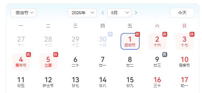 放假时间:2026年5月1日-5日。5月9日(星期六)正常上班。